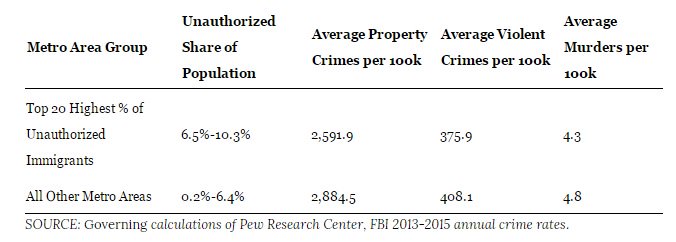 The best social science generally finds that communities with larger and/or growing immigrant communities (including studies that don’t distinguish between status and those that just look at undocumented like the one above) have lower rates of crime or show no difference from all others. That doesn't make anyone who has been victimized by an undocumented person feel any better but it should inform public policy.